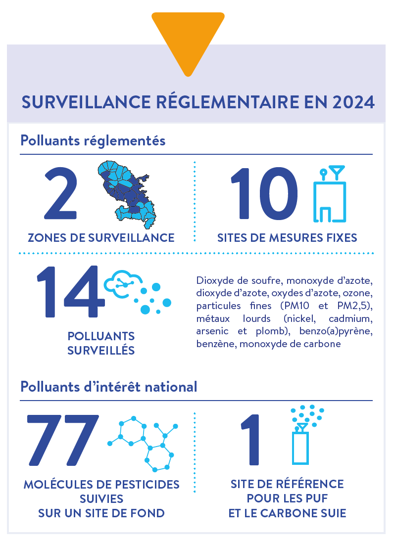 Conformément au dispositif national de surveillance, Madininair a suivi en 2024 14 polluants réglementés sur dix stations fixes réparties entre la zone à risques et la zone régionale.
