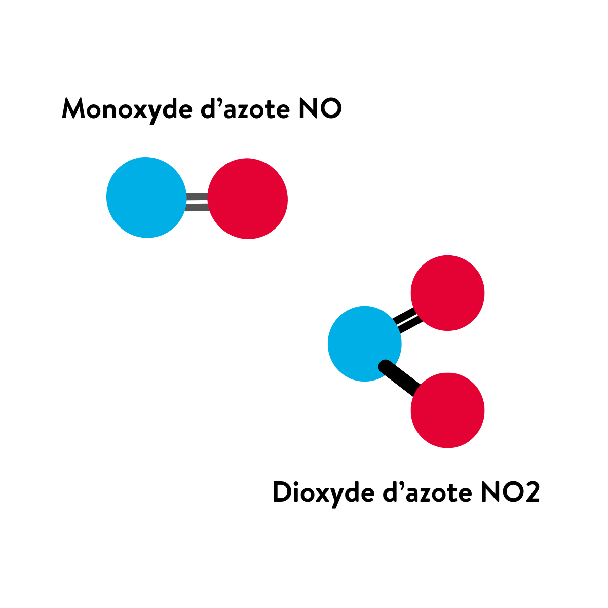 La combinaison de l’azote et de l’oxygène de l’air conduit à des composés de formules chimiques diverses regroupés sous le terme NOx. Régulièrement mesurés, le monoxyde d’azote NO et le dioxyde d’azote NO2 sont émis lors des phénomènes de combustion. Le NO2 est issu de l’oxydation du NO. Les sources principales sont les transports, l’industrie, l’agriculture et la transformation d’énergie. Le NO2 se rencontre également à l’intérieur des locaux où fonctionnent des appareils à gaz tels que gazinières, chauffe-eaux…